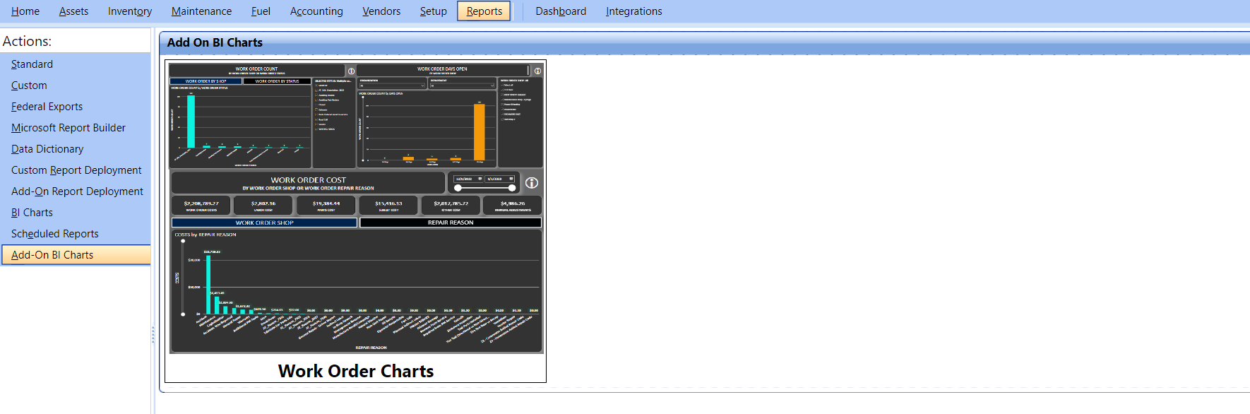 The Add-On BI Charts section allows you view additional BI Charts that you have purchased from FASTER.
