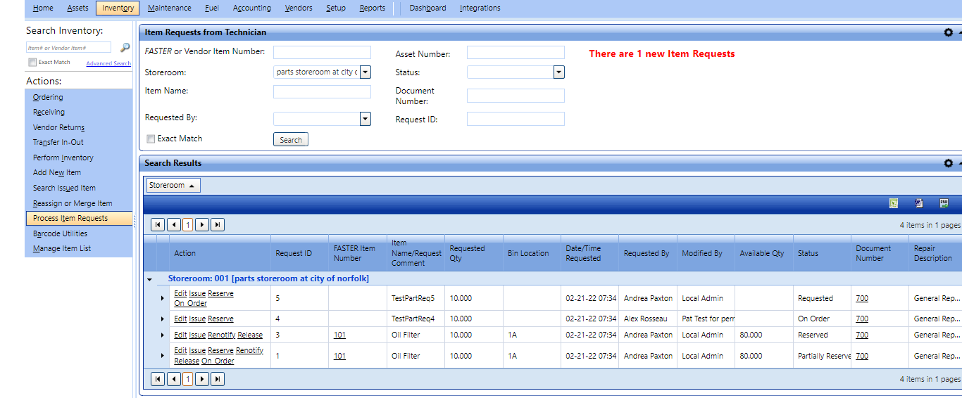 Note: You can search the item requests with one of the following status: · Requested - Item request is raised by the technician. · Issued - Item requested is issued to the technician. · Partially Issued - Item requested is partially issued to the technician. · Partially Reserved - Item request where a quantity of Item requested is partially reserved. · Reserved - Item request where a quantity of Item requested is reserved. · Canceled - Item requested by the technician is canceled. · Parts Vendor Issued - Item request by the Inventory Import Utility (IIU) imported issue records. · On Order - Item request status is changed to On Order. |
