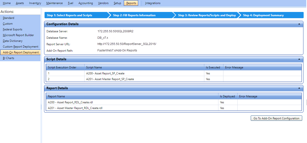 Note: To go back to Add-On Report Deployment page, click the Go To Add-On Report Configuration button.